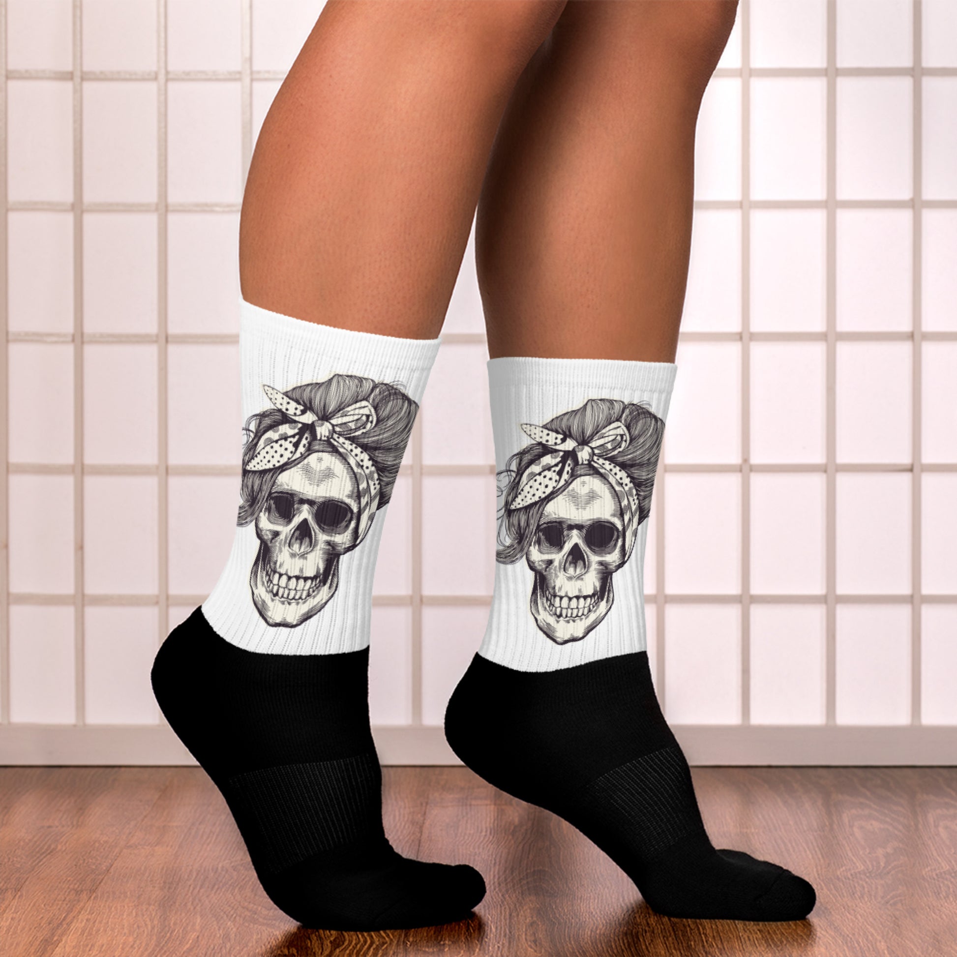 Ces chaussettes sont extrêmement confortables grâce à leur fond rembourré. Elles sont noires au niveau du pied, avec des motifs imprimés aux couleurs vives et éclatantes le long de la jambe.