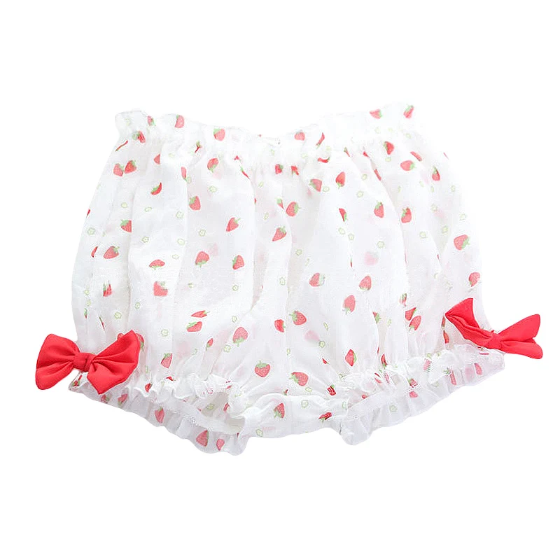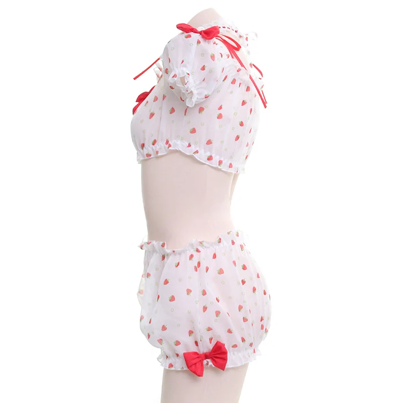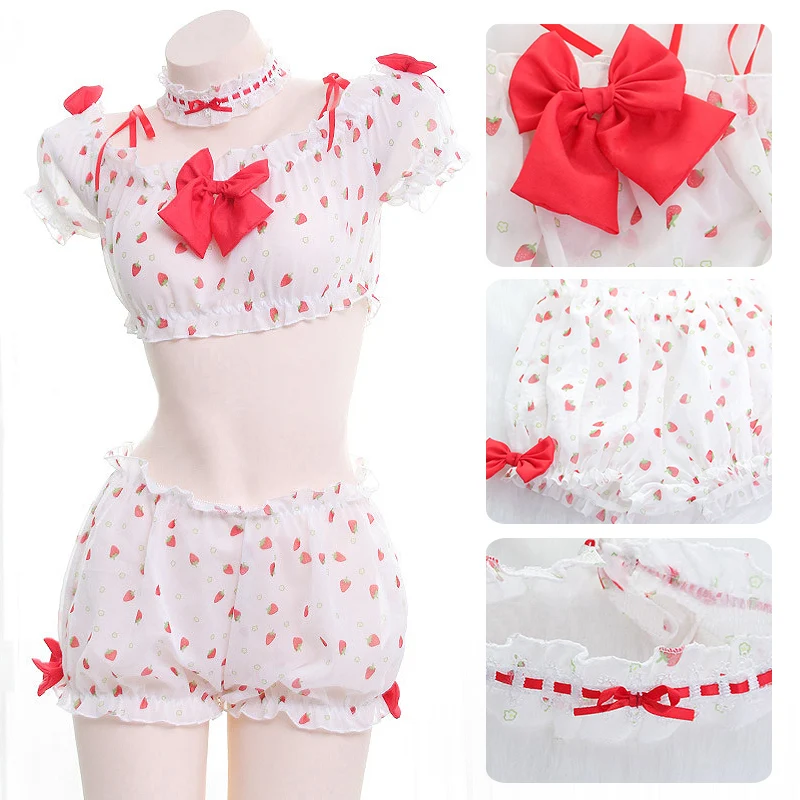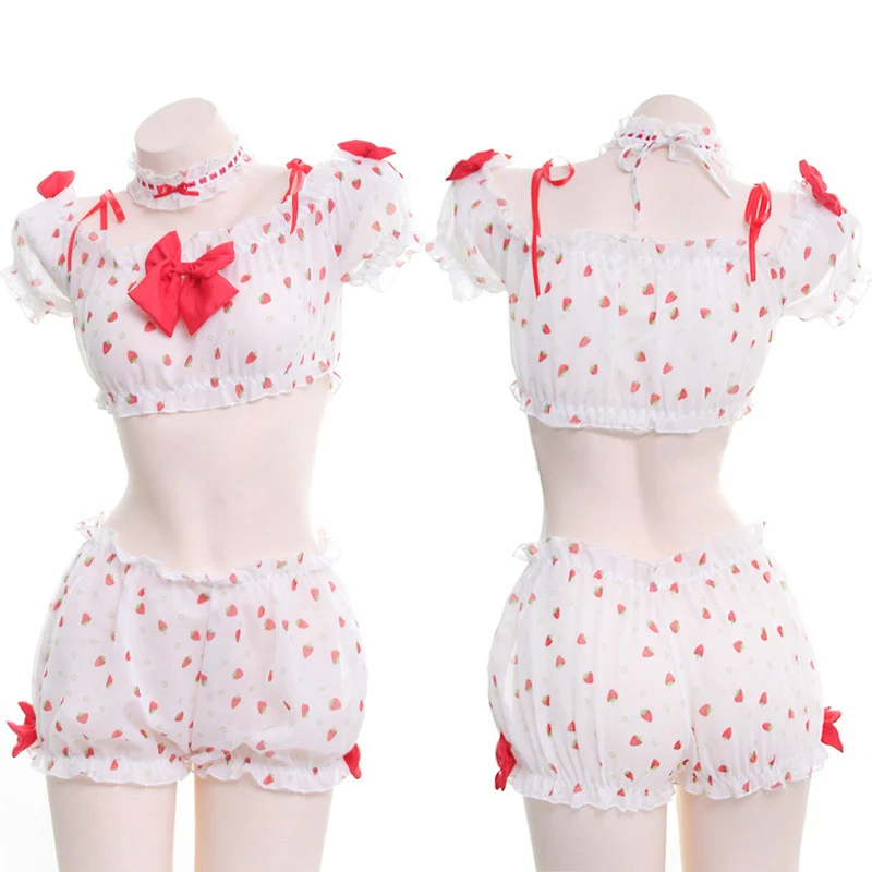 Women Sweet Strawberry Print Lingerie Set Ruffles Bowknot Crop Top Shorts Pajamas Kawaii Anime Lolita Cosplay Nightwear Lingerie